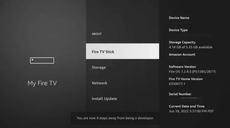 3. Hover over Fire TV Stick and click the OK button on your remote 7 times to become a developer.